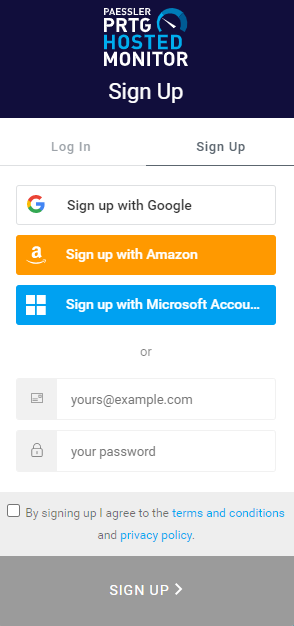 1. You can sign up with your Google, Amazon, or Windows account via single sign-on (SSO) (Auth0). PRTG Hosted Monitor connects to and then automatically uses this account for the login. Click the respective button and follow the instructions. Alternatively, you can sign up via email. Enter a valid Email address and a Password. The password must meet the following requirements: