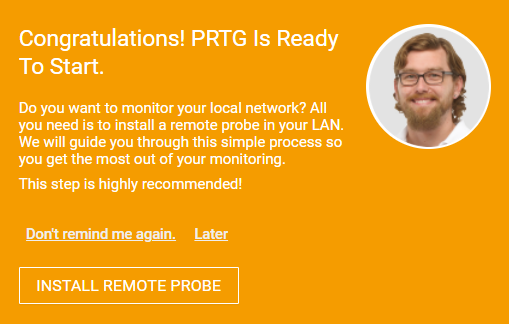 A Paessler employee guides you through the smart setup. In particular, you must install a remote probe, which is required for monitoring your LAN. We strongly recommend that you do so.