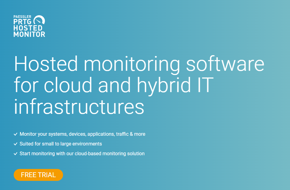1. On the PRTG Hosted Monitor Customer Portal, click Free Trial to create your PRTG Hosted Monitor instance. PRTG Hosted Monitor automatically assigns a domain name to your instance. You can change the domain name at any time.