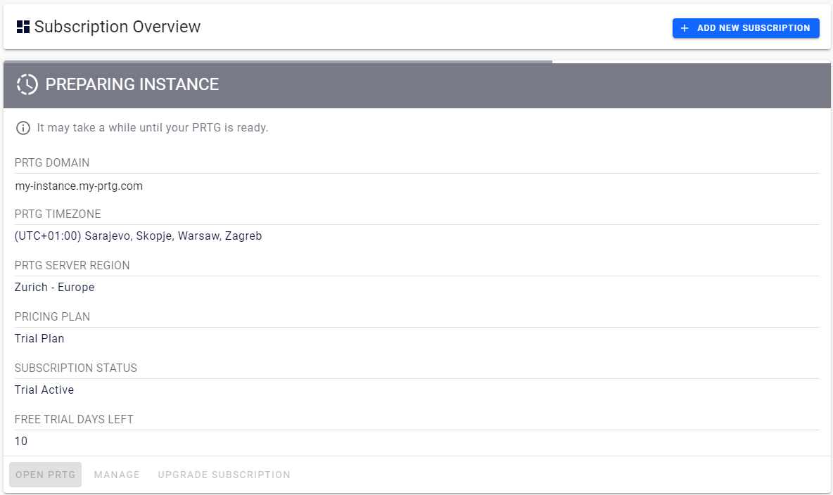 1. The Subscription Overview page opens and shows the progress of the PRTG Hosted Monitor installation.