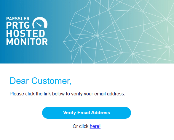 1. Make sure that you agree to the terms and conditions and privacy policy. Click Sign Up to register for your PRTG Hosted Monitor instance. You then see that a verification email has been sent to your inbox.