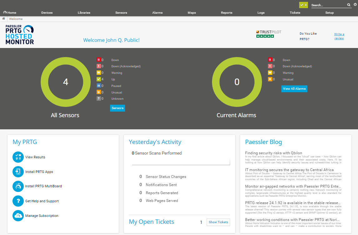 1. Your PRTG Hosted Monitor instance is now ready. Click Open PRTG to open your PRTG Hosted Monitor instance in the PRTG web interface.