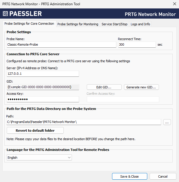 Click Save & Close to confirm your settings and to (re)start the PRTG probe service.